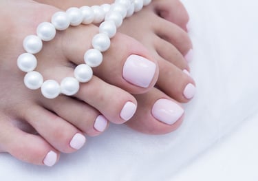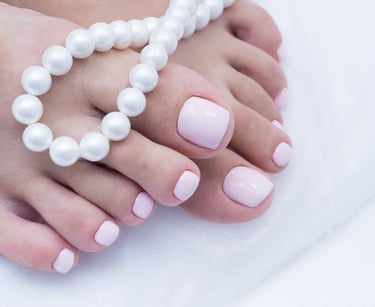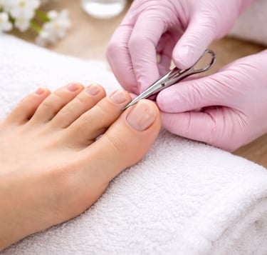 Soin complet des pieds inspiré des techniques de pédicure médicale : mise en forme des ongles, travail précis des cuticules, nettoyage approfondi des sillons, élimination des callosités et hyperkératoses au pododisque, suivi d’une hydratation nourrissante.